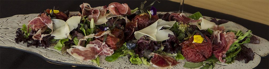 Pink tomato carpaccio with anchovies and black olive tapenade